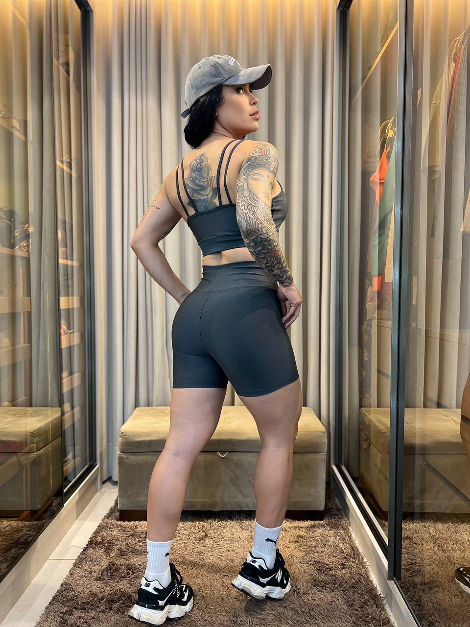 Produzido em suplex poliamida premium, o tecido oferece compressão ideal, toque macio e zero transparência, garantindo sustentação e conforto em qualquer movimento. O grande destaque fica por conta do top estilo blogueira, com recorte moderno e sustentação firme, que valoriza o colo e o shape com muito charme. O shorts cintura alta modelador completa o conjunto com equilíbrio entre elegância e liberdade.